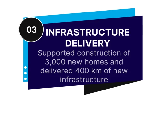 3. Infrastructure Delivery: Supported construction of 3,000 new homes and 400 km of new infrastructure