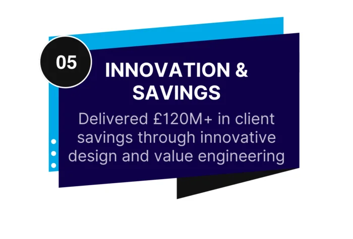 5. Innovation & Savings: Delivered £120M+ in client savings through innovation and value engineering.