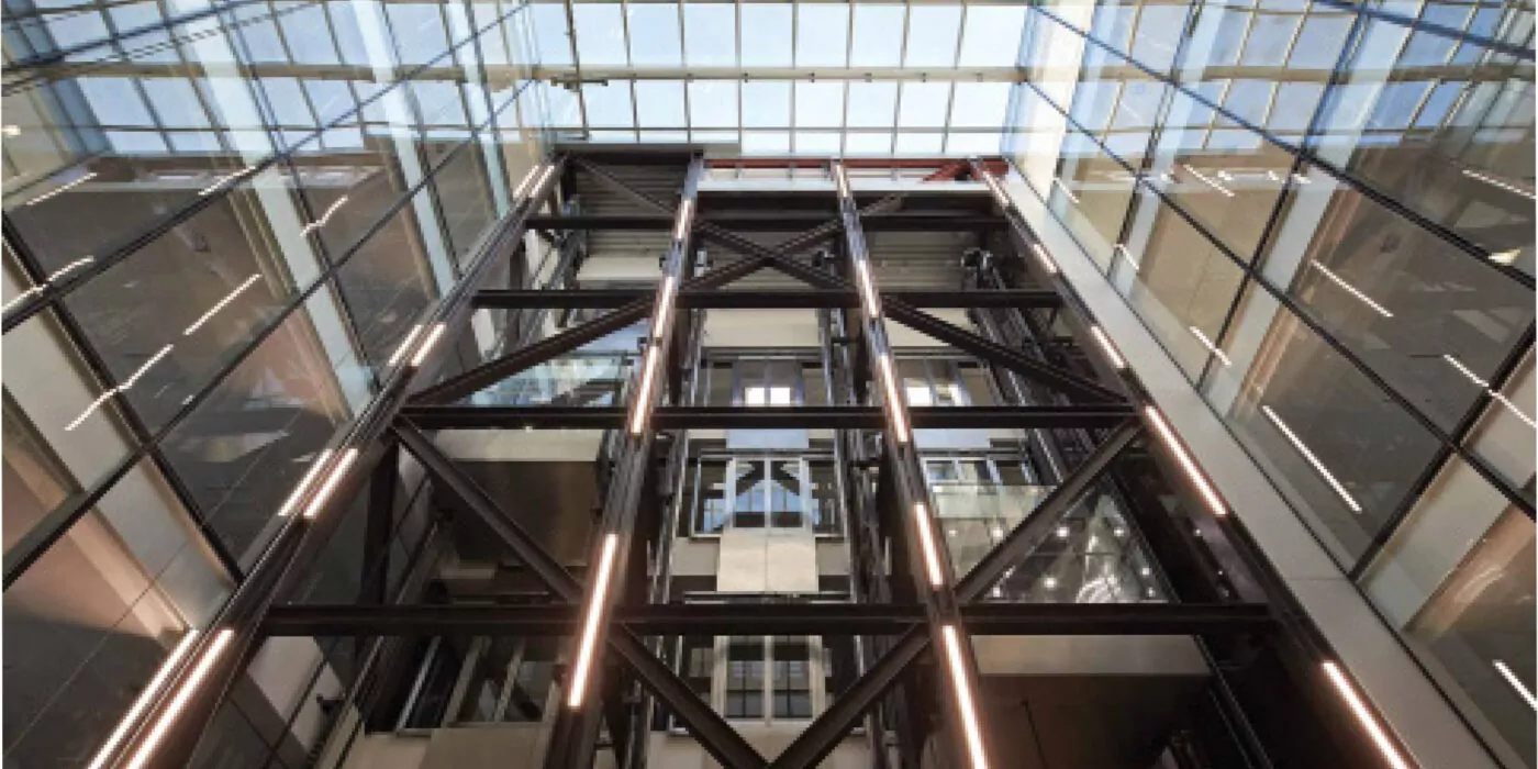 Innovative energy saving practices were employed throughout to maximise the efficiency of the building. Under the ‘green roof’ which channels rainwater to the local authority sewers is a façade glazed with ‘latest technology’ glass and cladding. These materials work to reduce solar gain and minimise heat loss. Heating and cooling recovery plant was added to reduce energy wastage, and the lighting was designed to LG7. A new, entrance and reception area lead to two full height atria housing the six panoramic passenger lifts. These too play their part in the building’s overall BREEAM ‘very good’ rating by returning electricity to the building using regenerative braking.