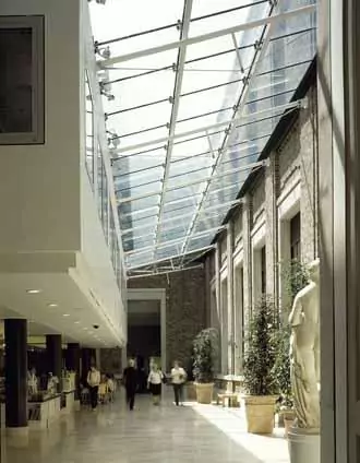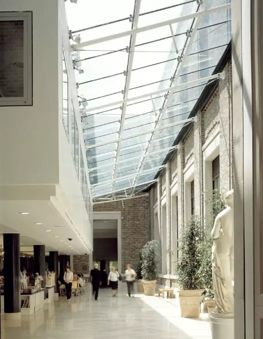 The development adds more than 32,000ft2 to the Museum’s footprint, housing exhibition spaces, a café, conservation laboratory, and an education department with study rooms. A large, double-height glass atrium creates a temporary exhibition space, joining the café area to the more historic structures.
